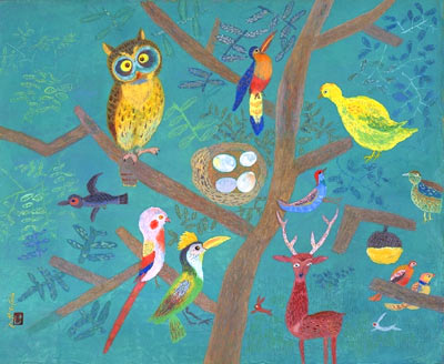 淡い緑色に塗られた背景のまんなかに、大胆に描かれた樹木の太い幹。そこに、さまざまな鳥たちが楽しそうに集っています。大きなミミズクや真上から見た鳥の巣などの描きかたには、ありのままを写生しようというこだわりは感じられません。おとぎ話の世界のようです。