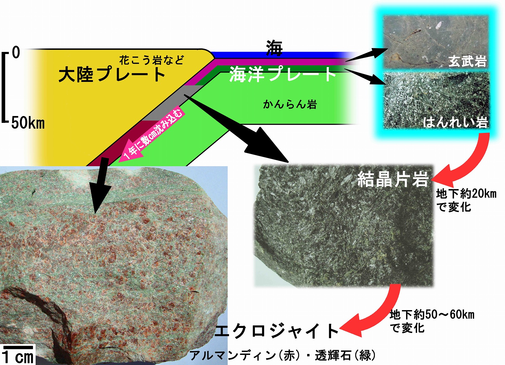 ![]() ややマグネシウムを含むアルマンディン(赤)・透輝石(緑)からなるエクロジャイト(愛媛県東赤石山) 最も普通に見られるエクロジャイトで,海洋プレート上部の玄武岩または中部のはんれい岩が,そのプレートの沈み込みで地下50〜60kmに引き込まれて約1万7000〜約2万気圧の圧力を受けて変成したもの(下図)。なお,その後に起こった弱い変成作用(後退変成作用)で,透輝石は部分的に黒っぽい角閃石類に変質していることが少なくない。 ![]() |