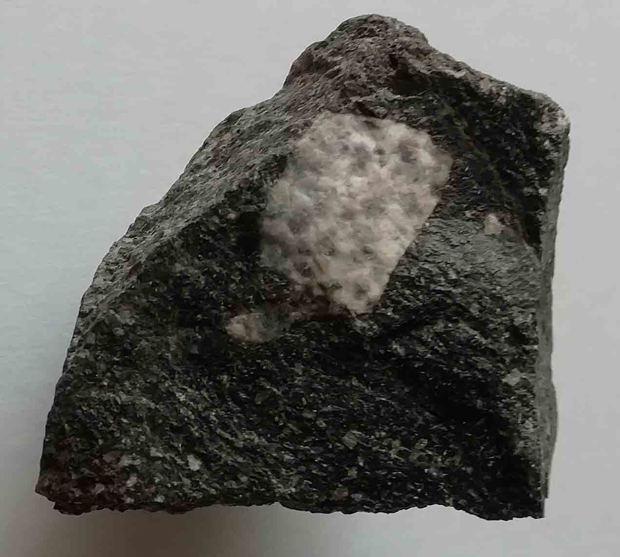 ![]() パイロ変成岩(ブッカイト)中の菫青石 Cod:菫青石 泥質岩〜砂質岩の岩片が約1000℃の安山岩マグマに取り込まれ,変成したパイロ変成岩(ブッカイト)中に見られる菫青石。斜方晶系の対称を持つドメインが6花弁状の双晶をなしている(消光状態で3つの双晶ドメインが組み合っている。特に右円内のものが明瞭)。菫青石は非常に高温では4面体サイトの6員環のAlとSiが無秩序配列した六方晶系のインド石(6花弁状の双晶はできない)になるが,この画像では意外にもこのような約1000℃の高温条件でも斜方晶系の菫青石が生じているのがわかる。 菫青石の周囲は微細なケイ酸アルミニウム鉱物や長石類,溶融ガラスである。 --------------------------------------------------------- 下画像)検鏡試料:玄武岩質安山岩(黒色)に捕獲された径2cmの白色の泥岩起源のパイロ変成岩 ![]() |