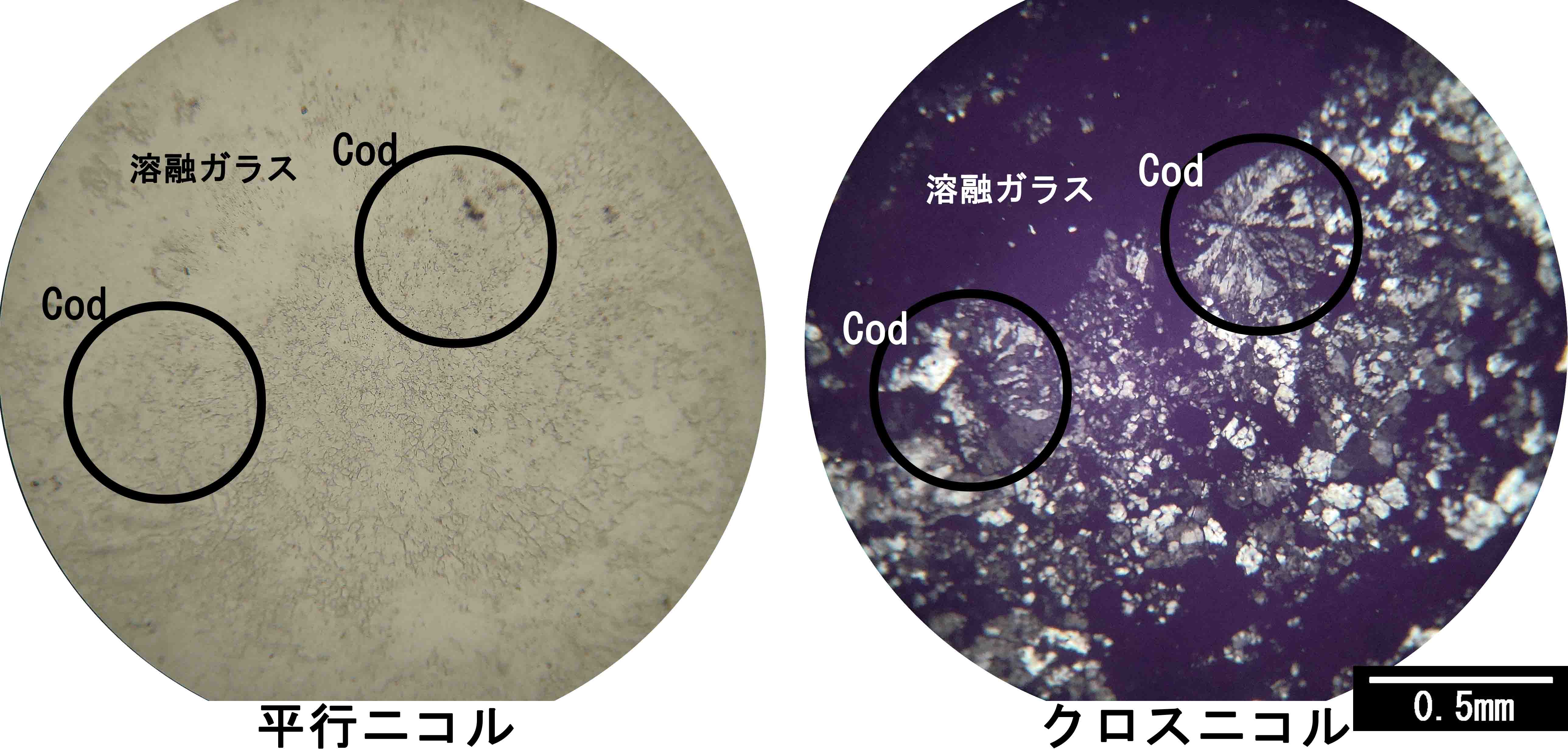 累帯構造:Mg⇔Feの置換があるが光学的には認められない。