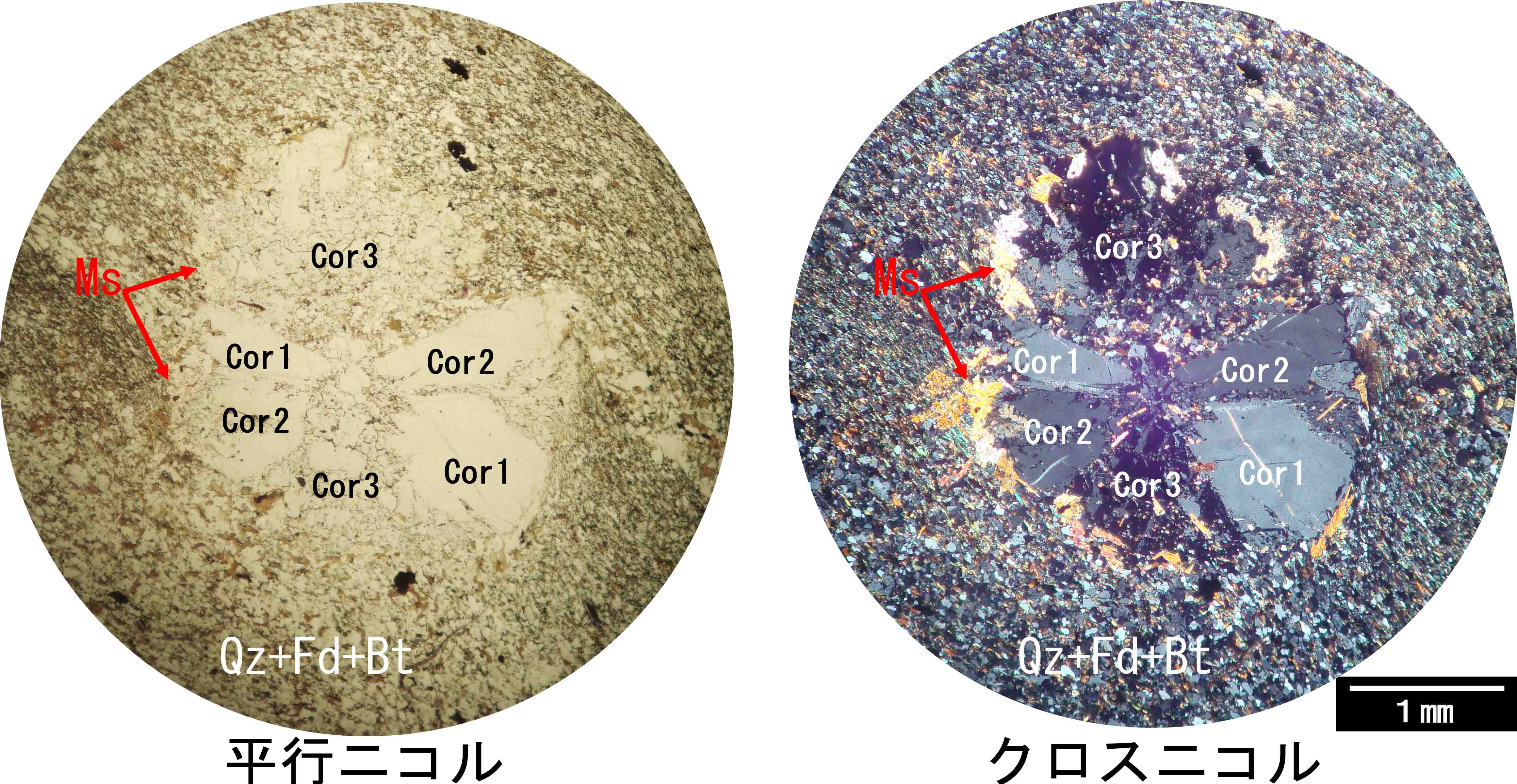 ![]() 泥質ホルンフェルス中の菫青石の斑状変晶の後退変成作用による変質部分(拡大) Cor:菫青石,Ms:白雲母,Chl:緑泥石,Fs:長石類,Qz:石英 泥質ホルンフェルス中に斑状変晶をなす菫青石は後退変成作用の際,結晶外縁部は周囲のアルカリ長石などのKと反応して白雲母化(干渉色が高い)しやすいが,結晶内部は周囲からのKの供給が乏しく緑泥石化(干渉色が低い)していく傾向がある。 |